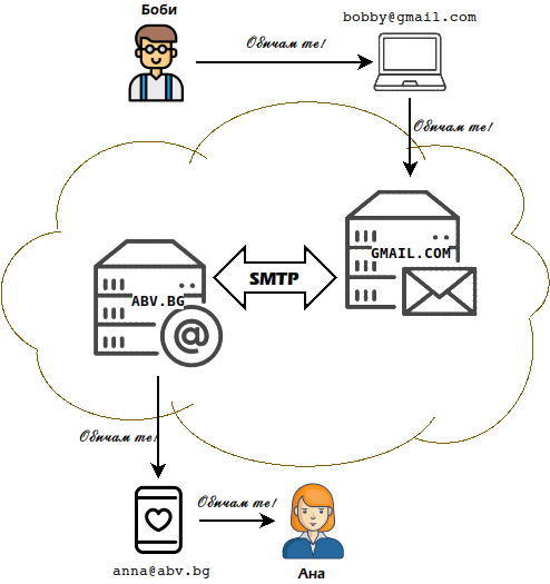 Какво става когато bobby@gmail.com прати електронно писмо на anna@abv.bg? С информацията за писмото (от кого, за кого, заглавие, съдържание и др.) се случва следното:
