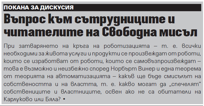 Повече от ясно е че властта няма да остави нещата на самотек и ще се опита да присвой всички средства на обикновените хора да се освбодят от нея.Навярно също както Microsoft присвой голяма част от IT сектора и превърна windows в търговска марка , така и роботите най-вероятно ще бъдат присвоени като производствен материал от дадена корпорация или корпорации.Много вероятно да е на основа на интелектуална собственост или някаква друга нелепица за която много щедро платените им корпоративни адвокати ще наложат монопол.Още е неясно как това ще стане и дали изобщо властта ще позволи затварянето на този гореспоменат цикъл(тя работи на принципа на шаха , тоест отговаря на всеки ход срещу нея с контра такъв).Другата хипотеза която явно някой хора ще да имат е следната – е може да го забави за известно време , ама рано или късно ще се наложи по естествени рационални принципи.Да ама властта настоява на себе си и нищо друго, всичко което я подронва тя отстранява инстинктивно.